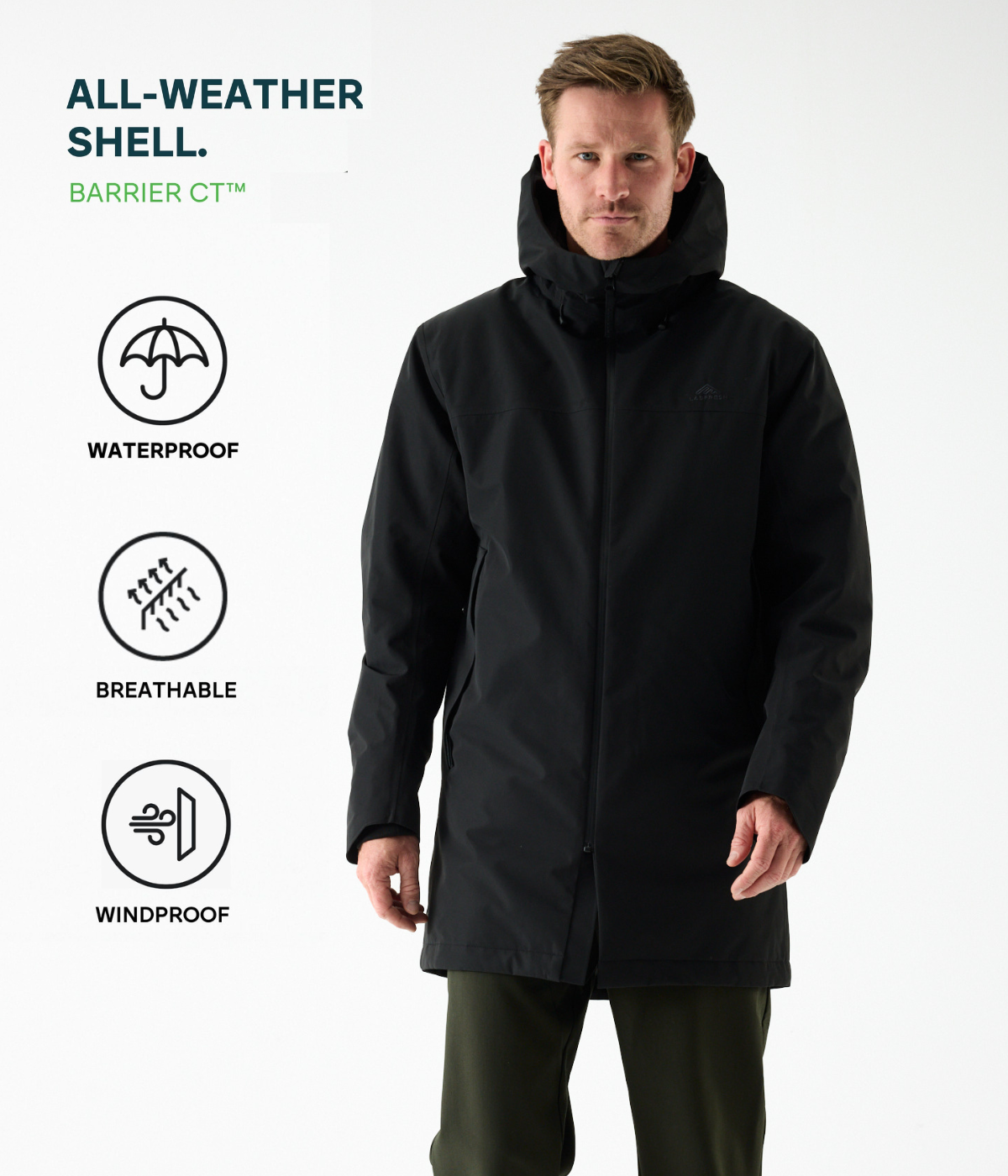Resultatet? En jakke til det virkelige liv – til gåture, cykelture, pendling og dage i regnvejr, uden at ligne en bjergbestiger. Skallen er lavet af BARRIER CT™, et højteknologisk materiale, der er fuldstændig vandtæt, vindtæt og åndbart. Skabt i Amsterdam af to brands med én fælles mission: at gøre dig klar til ethvert miljø med tøj, der holder.