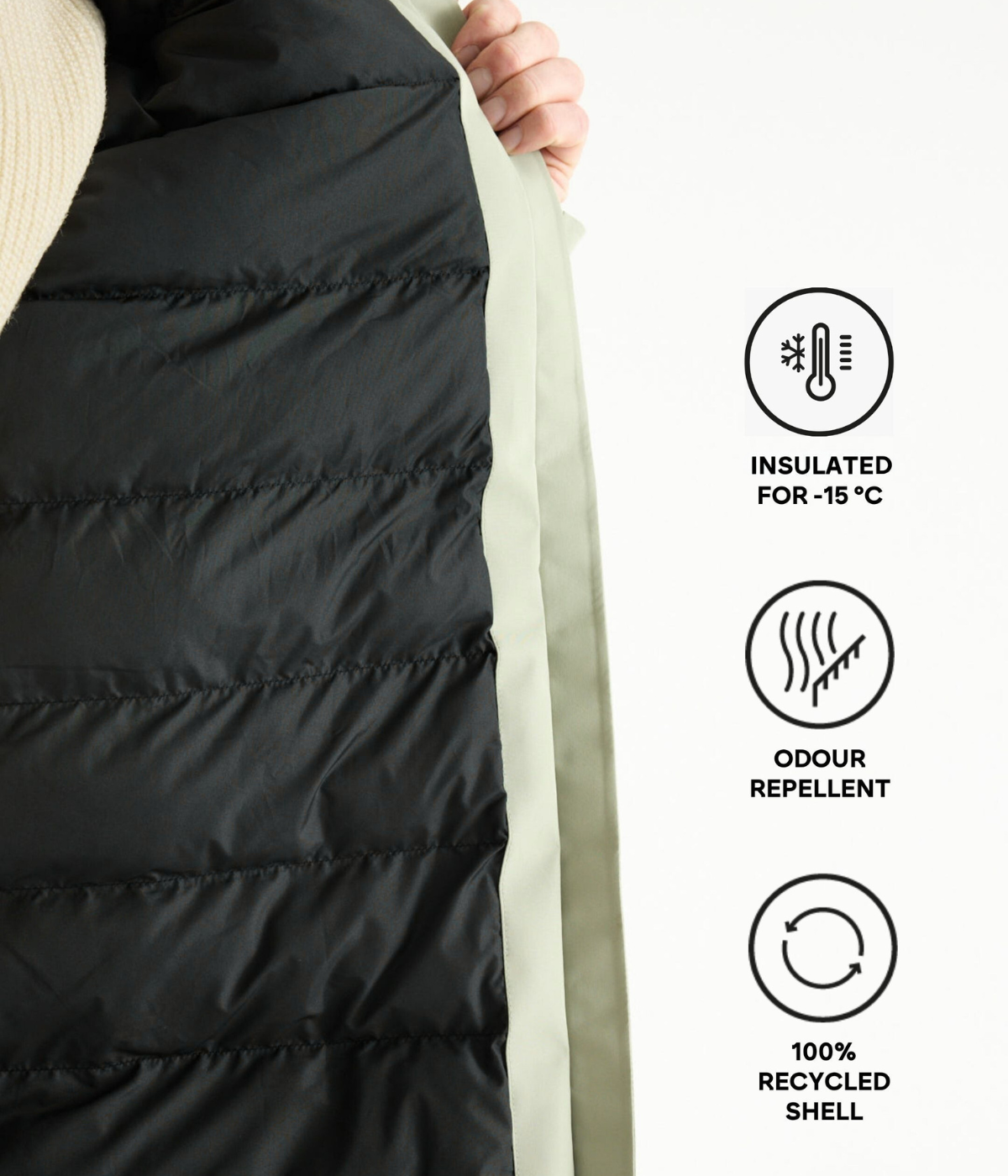 Yderskal og for er lavet af 100% genanvendte materialer. Det delvist biobaserede, genanvendte fyld holder dig varm helt ned til -15°, mens stoffets teknologi hjælper med at afvise lugte.