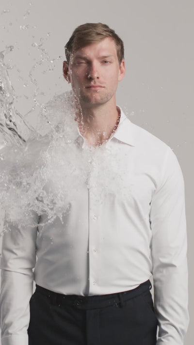 Komfortabel 4-vejs stretch, ikke-gennemsigtigt og strygefrit materiale med en raffineret, struktureret krave, der holder formen i dagevis – og selvfølgelig både væske- og lugtafvisende. De Ascolite®-forseglede knapper sikrer, at du aldrig mister en knap igen.