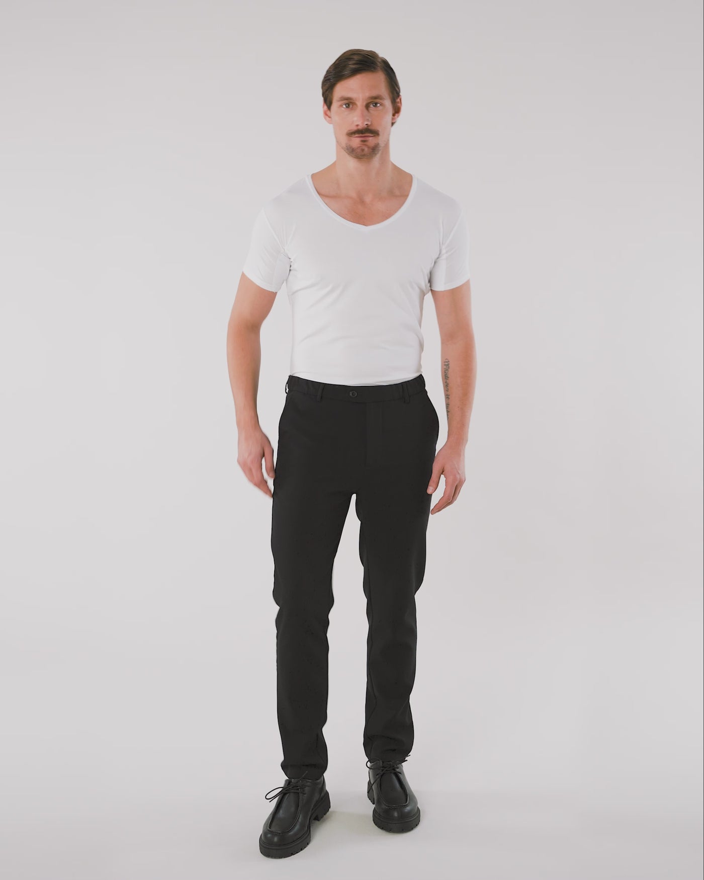 Undertrøjen er usynlig, når den bæres under en skjorte takket være den brede v-halsudskæring. |